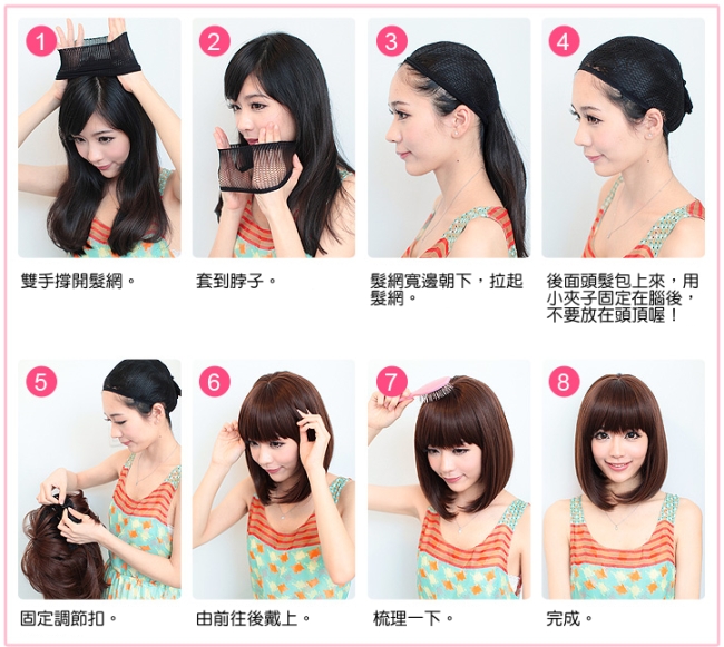 短髮:直接戴上假髮或使用髮網再戴上假髮。